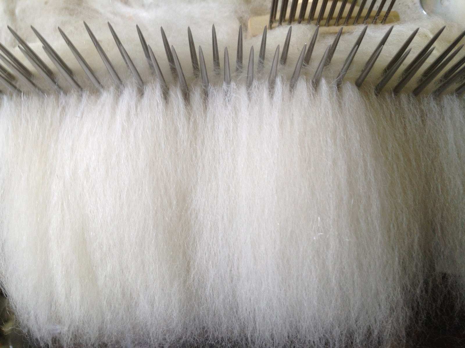 Step 4 – After the fleece is dry (and it MUST be dry), we begin prepping the fiber by either combing or carding it. You can use hand carders, drum carders, blending hackles, whatever to prep your fiber. For this particular batch of fiber (Dante), it was so fine (approx 19 microns)and it had some VM in it and I quite frankly I didn’t want to stand at my drum carder, so I sat and relaxed with my combs and hackle 🙂