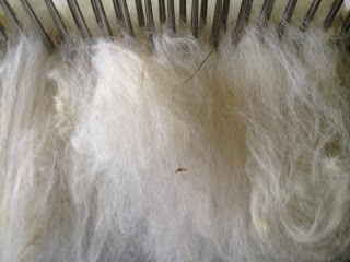I chose to skip picking and go straight to combing. Here is the fiber on my hackle. As you can see it is all jumbled up, some vm and a general mess.