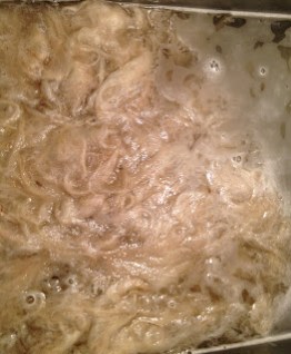 Step 3 – Washing the fleece (this process is for alpaca, if you have sheep it is slightly different). After the fleece has been skirted, sorted, graded and blown out to remove even more debris, I take the fleece that I will use for a certain project and wash it. You can wash in a sink, bath tub, muck bucket or old top load washer. Whatever the vessel is that you use, the process is the same.