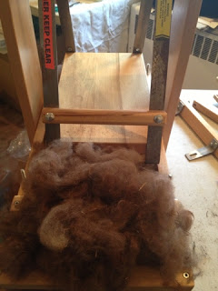 Here are some pictures of Rosalita’s fleece being picked. The fleece goes into the back of the picker (this is a swing arm triple picker). It has many, many sharp points to “open” up the fleece. This is NOT a toy and can be quite dangerous (as all fiber prep tools can be), but is a necessary tool for fiber folks.
