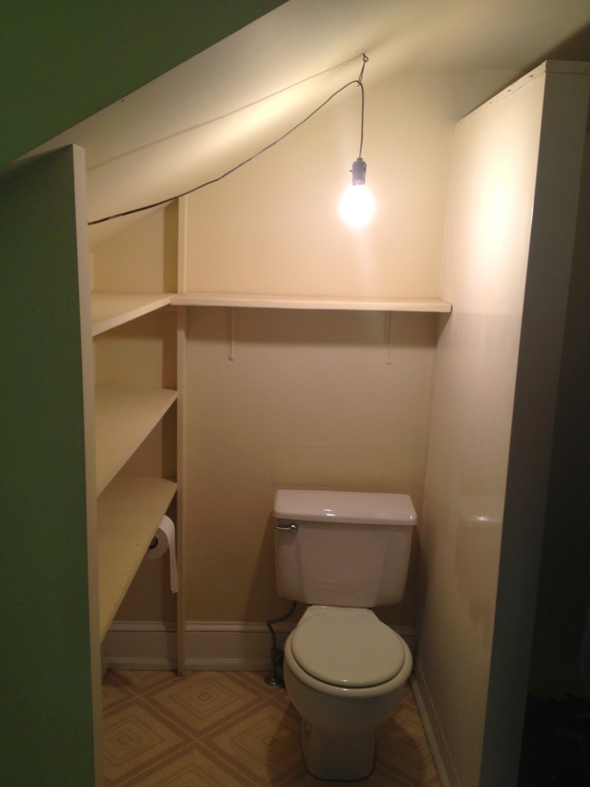 The toilet was not in terrible shape, but years (possible decades) of not being used left a permanent stain in the bowl. It is rather close to the shower, but to move it would have been a huge undertaking in plumbing, so we decided to leave it and make it work. The only storage in the room was plywood shelving that was not even sanded smooth next to the toilet. The bare bulb had scary wiring and was just bizarre.