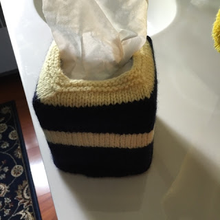 | I knitted this tissue box holder from the left over yarn of the woven table topper. |