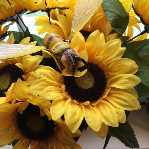 | A bee in the middle of the sunflowers. An homage to our own honeybees. |