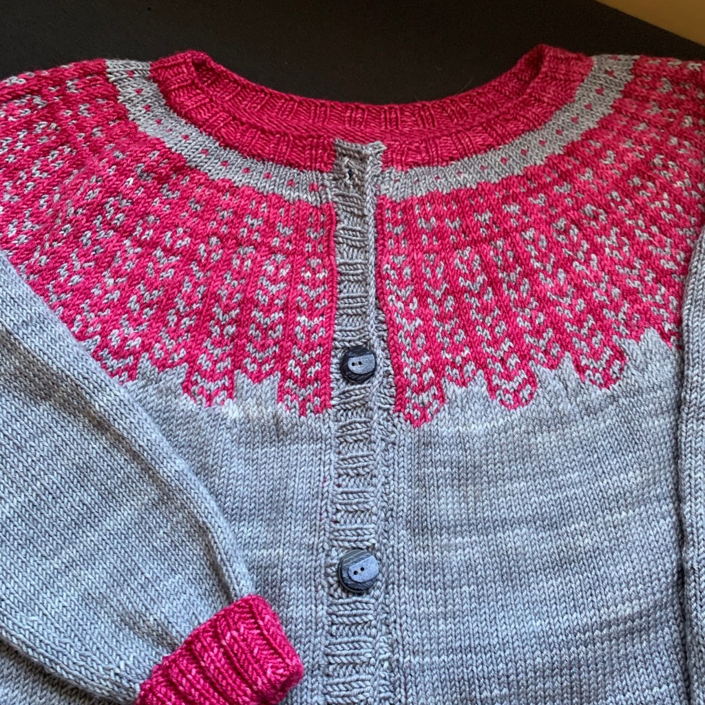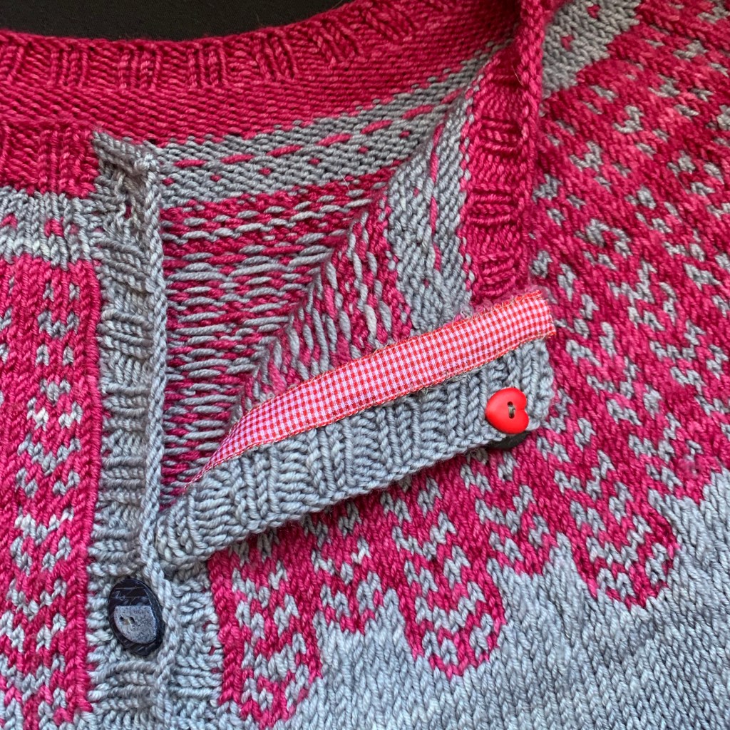It is superwash merino, so I hand-sewed the reinforcements as well as crochet reinforced. I then applied some grosgrain ribbon and used stitch-witch to tack down the reinforcements. I then stitched around the ribbon to provide another level of security. Pro-tip . . . when adding buttons to knitting, put a button in the back as well, so the buttoning-unbuttoning does not pull on the knitted fabric.